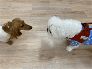 おすわりをすることで体が止まり、クールダウンしやすくなりますよ♪